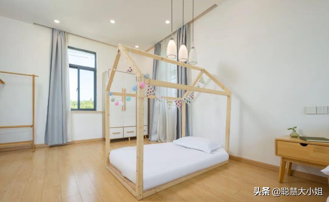 用木条制成的木屋儿童床,屋顶上挂上彩色小旗和五彩小球,营造出一个梦幻的童话世界。