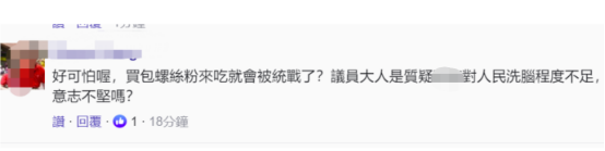 对此,有岛内网友讽刺道:“好可怕哦,买包螺蛳粉来吃就会被统战了?议员大人是质疑民进党当局对人民洗脑程度不足,意志不坚吗?”↓